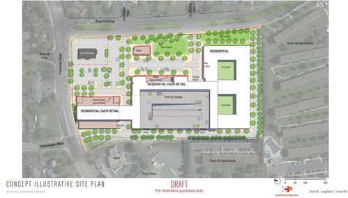 Combined Properties has submitted a revised plan for redevelopment of the Rose Hill Plaza shopping center (pictured above). Company spokesman Gregory A. Riegle, in an email to Rose Hill Civic Association President Carl Sell, described the following changes from the original proposal presented in March 2022:
