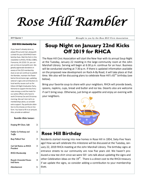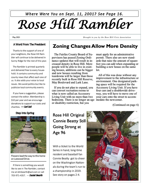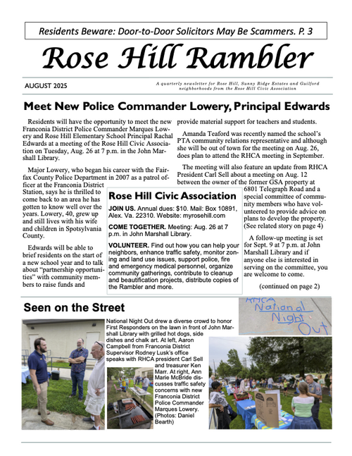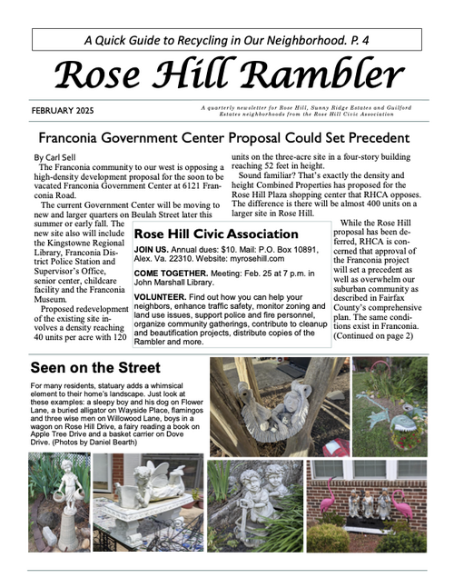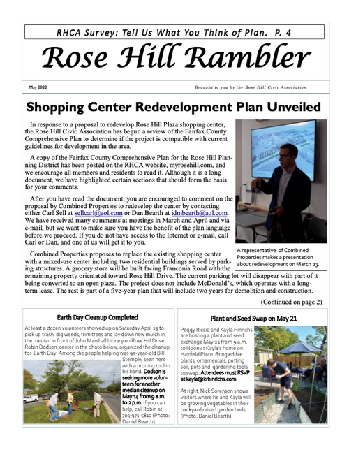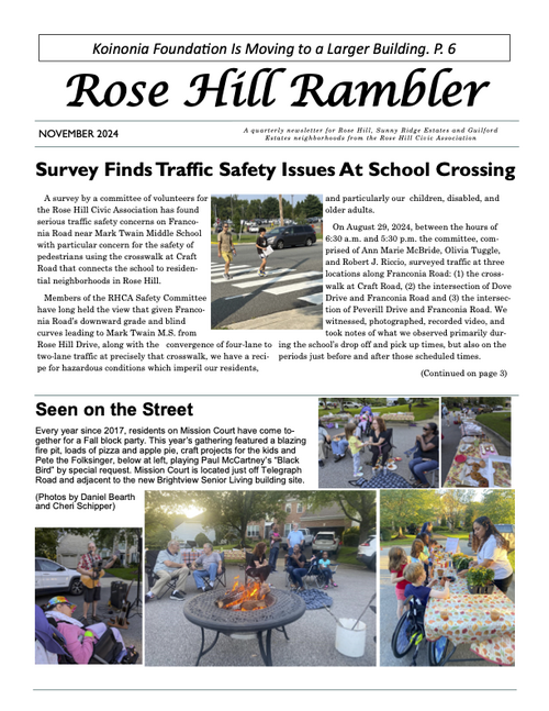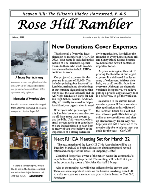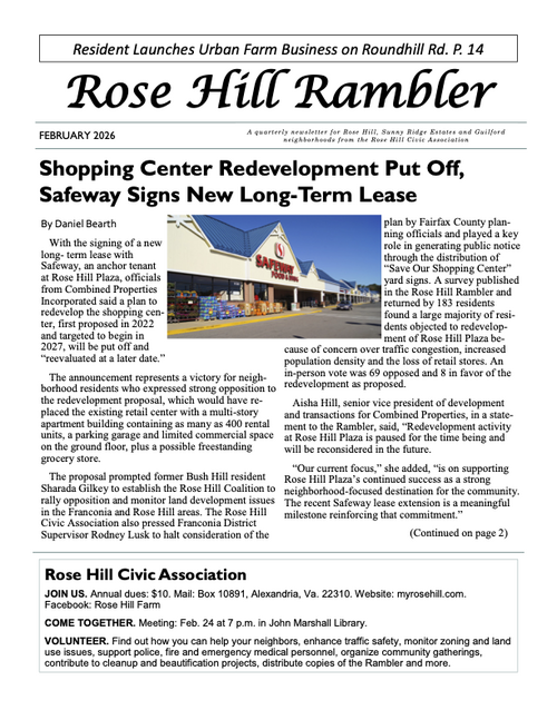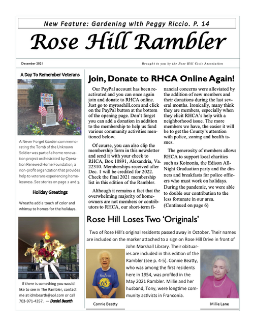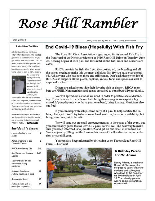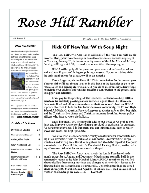 The Rambler is the Rose Hill Civic Association newsletter. A printed newsletter is delivered to all of our Rose Hill neighbors quarterly. Electronic newsletters and information are sent via email on an as needed basis. You can find an archive of past Ramblers below, and we post a copy of the Rambler's quarterly featured article on the home page of this website. To join our email list please click below.